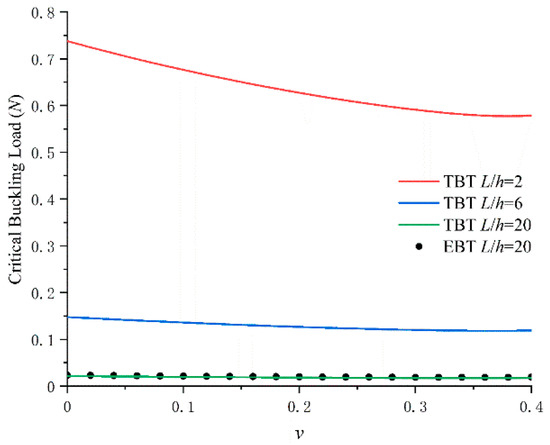 Finally, the influence of Poisson’s ratio on the critical buckling load of EBT and TBT with simply supported boundary condition are shown in Figure 8. The geometries are b = 2h and h = lm = 17.6 μm. It can be clearly seen that the effect of Poisson’s ratio increased as the L/h decreased and the critical buckling load decreased as Poisson’s ration increased, which is in line with the general trends obtained in [41,71]. Therefore, a significant error may be produced by neglecting Poisson’s ratio for thick beams.