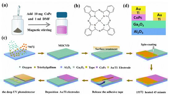 (a) Procedures for preparing the CoPc precursor solution. (b) Molecular structure of the semiconductor CoPc. (c) The fabrication of the CoPc/Ga2O3 heterojunction ultraviolet photodetector. (d) The cross-section of fabricated devices.