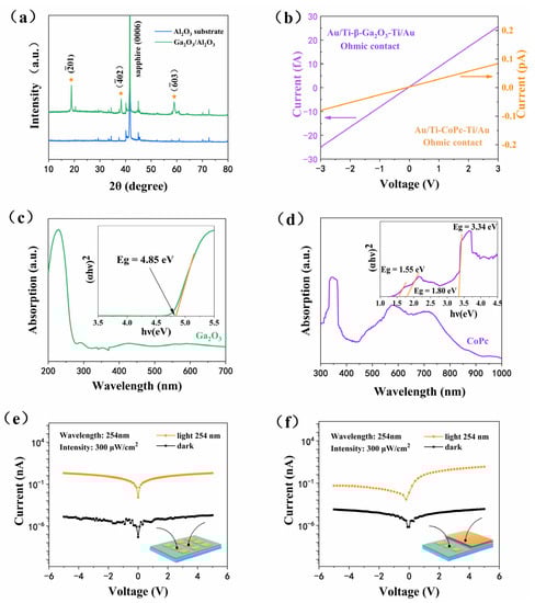 (a) The XRD patterns of Ga2O3/Al2O3 films by MOCVD. (b) The I-V curves of Au/Ti-Ga2O3-Ti/Au and Au/Ti-CoPc-Ti/Au under dark. The optical absorption curves of (c) Ga2O3 film and (d) CoPc film; inserts represent the estimated bandgaps. The semi-log scale I-V curves of (e) Ga2O3 film and (f) CoPc/Ga2O3 heterostructure.