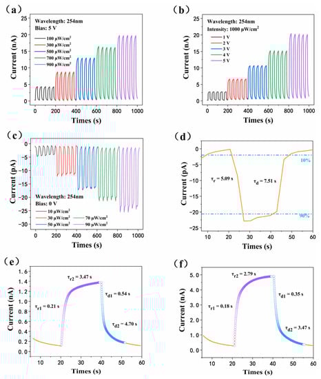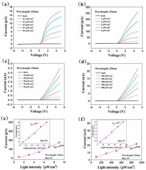 We have carefully measured the I-V curves of the heterojunction device at various light intensities. The I-V curves for the light intensity ranges of 0.1–0.9 μW/cm2, 1–9 μW/cm2, 10–90 μW/cm2 and 100–900 μW/cm2 are displayed in Figure 3a–d, respectively. The test results indicate that the device is very sensitive to changes in ultraviolet light intensity and has a wide sensing test range. The device is capable of detecting weak UV signals even at 0.1 μW/cm2, and still has good discrimination for light intensities less than 1 μW/cm2. With increasing light intensity, the photocurrent of the heterojunction gradually increases because of the absorption of more photons in the photosensitive region and thus the excitation of more photogenerated carriers []. No matter how the light intensity changes, the device shows outstanding rectification characteristics. Under the light intensity of 900 μW/cm2, the rectification ratio of the device reaches 144.96 at ±5 V. The photocurrents in different light intensity ranges at 5 V are shown in Figure 3e,f, respectively. The relationship between photocurrent and light power can be fitted by the following formula: Iph ∝ Pθ, where Iph, P, and θ are photocurrent, light power, and empirical coefficient. For different light intensity ranges, the values of θ were fitted to 0.97, 0.93, 0.91, and 0.88, respectively. The linearity of the photocurrent decreases with increasing light intensity because large light intensity increases the scattering of carriers and the chance of recombination of electron-hole pairs. The unavoidable defect states in the semiconductor film preparation process would also become the recombination centers of carriers [].