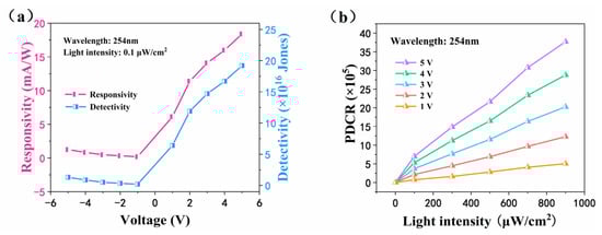 (a) The responsivity (R) and the detectivity (D*) of the heterojunction device with an intensity of 0.1 mW/cm2 under different voltages from −5 V to 5 V, voltage step is 1 V. (b) The PDCR versus different light intensities under 1 V, 2 V, 3 V, 4 V, and 5 V, respectively.