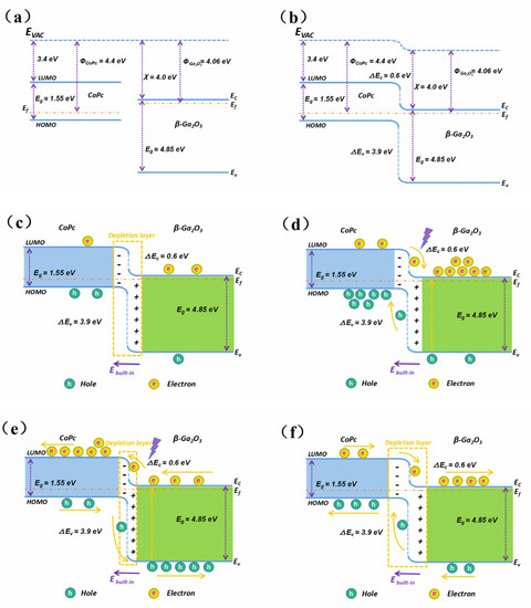 Schematic energy band diagrams of the CoPc/Ga2O3 heterostructure (a) before contact, (b) after contact, (c) under dark conditions, (d) with 254 nm light under 0 V, (e) with 254 nm light under forward voltages, and (f) with 254 nm light under reverse voltages.
