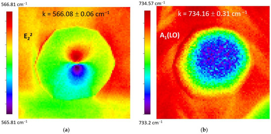 Raman spatial map (80 μm × 80 μm) of (a) the phonon energies of the strain-sensitive E22 and (b) the free-carrier-sensitive A1(LO) phonons. Note the strain-dipole pattern in the 12-sided central region, that region having lower free-carrier concentration.
