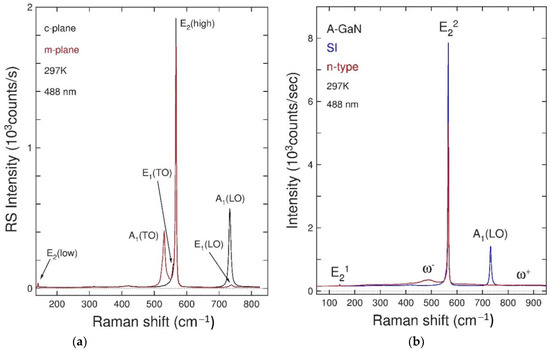 High crystalline quality GaN substrates are needed for the growth of epitaxial GaN films having lower dislocation densities. Figure 3 shows room temperature measurements of the first order RS spectra of m- and c-plane of SI and unintentionally doped Am-GaN samples. Peak positions and reduced line widths of the observed first order phonons indicate good crystalline quality and lower biaxial stress of the Am-GaN wafers. These observations are consistent with results published by Gogova et al. Ref. [26] for m-plane non-intentionally doped substrates. A high background concentration of free-electrons, caused by a high concentration of uncompensated shallow donors, results in the formation of a free-carrier collective mode (plasmon) with low and high dispersion curves, ω− and ω+, seen in Figure 3b. The plasmon modes couple with the polar phonons [A1(LO) and E1(LO)] introducing the new vibrational mode LPP (LO-phonon-plasmon coupled mode); whose peak positions increase with increasing free-electron concentration. Spectral analysis of the LPP can be conveniently used to estimate the residual doping level of the samples [27,28].