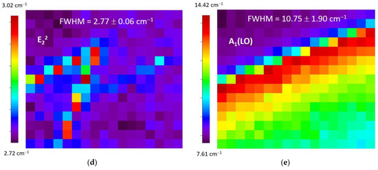 (a) Optical image of extended defects in a 128 μm × 112 μm region on the Ga-face of an HVPE-GaN film grown on Am-GaN. Raman map of the frequency of the (b) strain-sensitive E22 phonon and the (c) free-carrier sensitive A1(LO) phonon over the region shown in (a). (d,e) are maps of the FWHM of these Raman lines.