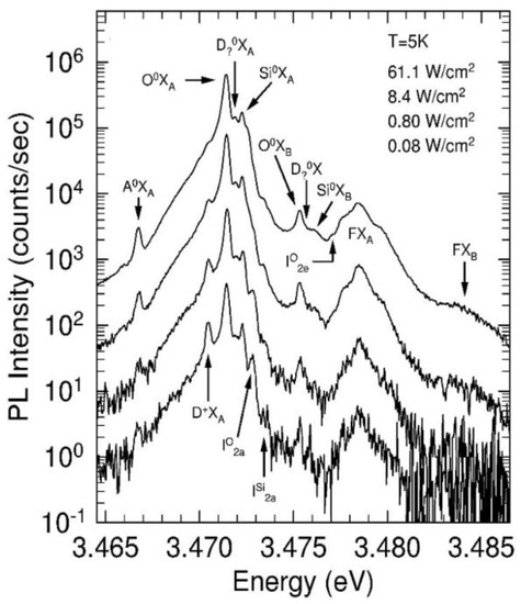 High-resolution and low temperature PL spectra of a FS HVPE sample, with low carrier concentration (~2 × 1016 e/cm3), acquired at the exciton ground state spectral region with different laser power densities. The line assignments are discussed in the text [36].