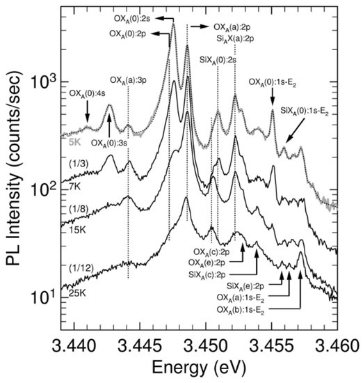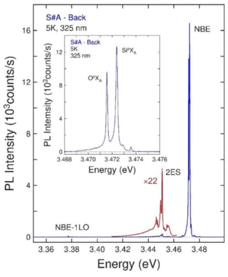 High-resolution PL spectra of the FS HVPE sample depicted in Figure 6, acquired at 4 temperatures, at the spectral region commonly called “Two-electron satellite” (2ES). The line assignments are discussed in the text [36].