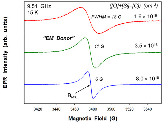EPR is valuable measurement technique for obtaining information on the concentration and (n- or p-) conductivity type of free carriers in GaN thin films and bulk substrates. A representative classic example is provided in Figure 12 for three GaN bulk samples (1 mm thick) grown by HVPE with the applied magnetic field, B, oriented parallel to the c-axis [54]. The samples were unintentionally doped but detailed SIMS analyses revealed oxygen and silicon shallow donor impurities and, in some cases, compensating carbon impurities above their respective detection limits. We note that O is the residual impurity with the highest concentration in these three samples. Though other compensating acceptor-like centers may be present, we label each of the spectra by the net concentration of shallow donor centers (i.e., [O] + [Si] − [C]) as provided by the SIMS measurements. A single EPR line at 15 K with axial symmetry was observed for each sample with g||~g⊥~1.95 and with varying FWHM linewidths (6–18 G). Most notably, this resonance was firmly established by several groups [55,56,57] as a “fingerprint” of shallow donors/conduction electrons in GaN and its observation gives definitive proof of the n-type character of these samples. Unfortunately, due to the absence of resolved electron-nuclear hyperfine structure it is not possible to assign this EPR feature with Si or O impurities that are well-known sources of n-type conductivity in GaN. A clear trend found for these spectra is the decreasing FWHM linewidth for samples with increasing (uncompensated) shallow donor concentration. This ‘motional narrowing’ behavior can be understood as the averaging out of the electron-nuclear hyperfine interaction between the donor electron spin and the nuclei of the host lattice atoms as discussed in previous EPR studies of n-type GaN [55].