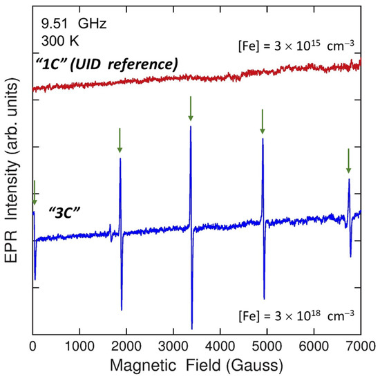 As discussed above, the intentional introduction of Fe impurities during growth is often employed to produce semi-insulating bulk GaN. Especially for thick GaN substrates grown by HVPE, such deep level acceptor centers with concentrations of ~1016–1018 cm−3 are very effective in compensating residual Si and/or O shallow donors and, thus, make such Fe-doped GaN substrates very useful as templates for high power/high temperature device applications. Similar to the example given above for shallow donors, EPR provides a characteristic signature for the incorporation and activation of Fe centers on the host Ga lattice sites in GaN. As an example, EPR spectra at 300 K for nominal undoped and intentional Fe-doped HVPE-grown GaN substrates (1 mm thick) are shown in Figure 13 [52]. These samples were also well characterized by SIMS to obtain the background C, O, and Si impurity concentrations and the Fe doping levels. The sample “3C” with an Fe doping concentration of 3 × 1018 cm−3 exhibited a 5-line EPR pattern (green vertical arrows) with the magnetic field applied parallel to the c-axis that has been firmly associated with spin S = 5/2 Fe3+ ions substitutional on the Ga lattice sites (2S = 5 EPR lines) [58,59]. In contrast to the case for shallow donors in GaN, we note that the long spin-lattice relaxation times associated with the Fe3+ ions make it possible to observe strong EPR signals at room temperature. This situation is shown in Figure 13, where no EPR signals above the noise level were found at room temperature for the reference GaN substrate sample. SIMS on this GaN substrate revealed a residual Fe concentration of 3 × 1015 cm−3, due to so-called ‘memory’ doping, that was lower than the residual Si impurity concentration. As a result, all of the Fe in this sample was compensated by the Si impurities such that the Fe ions were in the 2+ non-paramagnetic charge state.