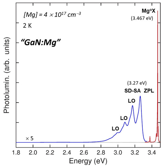 - Glaser, E.R.; Murthy, M.; Freitas, J.A., Jr.; Storm, D.F.; Zhou, L.; Smith, D.J. Optical and magnetic resonance studies of Mg-doped GaN homoepitaxial layers grown by molecular beam epitaxy. Physica B 2007, 401–402, 327–330. [Google Scholar] [CrossRef][Green Version]