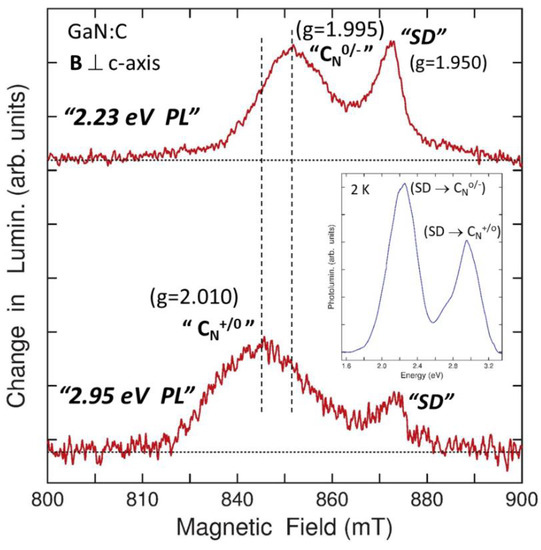 The electrical and optical properties of carbon dopants in GaN have also been topics of many experimental and theoretical studies over the last 30 years. In particular, carbon has been widely proposed as one of the sources responsible for the so-called broad “yellow” emission band with peak energy near 2.2 eV observed from unintentionally-doped n-type GaN grown by a variety of techniques (including MBE, MOCVD, and HVPE). For this review, it serves again as another demonstration of the power of the ODMR technique to shed light on the nature of these C impurities in GaN. For example, the ODMR at 24 GHz that was separately obtained on the 2.23 eV “yellow” (top spectrum) and 2.95 eV “blue” (bottom) PL bands from a 600 μm-thick, HVPE-grown GaN bulk substrate with carbon doping level of 1 × 1018 cm−3 is shown in Figure 17 [65]. These emission bands are displayed in the inset of Figure 17; note that the bandedge excitonic emission was quenched for this level of carbon doping. Two luminescence-increasing resonances are found on each of these PL bands with B ⊥ to the c-axis. The first (labeled SD) is common to each spectrum and is assigned to residual shallow donors (either O and/or Si impurities as revealed in the SIMS measurements) based on its characteristic g-value of 1.95 as discussed above. The second ODMR signal observed on the 2.23 eV PL band has a g⊥-value of 1.995 and a FWHM linewidth of ~16 mT. These parameters are very similar to those reported previously by several groups [66,67,68,69] for a deep acceptor center typically revealed by ODMR on similar emission from unintentionally doped (n-type) and highly-resistive GaN epitaxial layers. Based on the strong correlation of this emission with C doping and theoretical modeling [r], this feature is ascribed to the (0/-) deep acceptor transition level (located ~0.9 eV above the valence band edge) of the CN defect center. The second ODMR signal found on the 2.95 eV PL band exhibits slightly different magnetic resonance parameters (as indicated by the dashed vertical lines in Figure 17) with a g⊥-value of 2.010 and a FWHM linewidth of ~20 mT. This resonance is tentatively ascribed to the (+/0) deep donor transition level (located ~0.3–0.4 eV above the valence band edge) associated with the CN defect centers as modeled in Refs. [70,71]. We note that EPR studies at 9.5 GHz of these same highly C-doped GaN bulk substrate samples revealed an isotropic broad signal with a slightly smaller g-value of 1.987 [72]. This difference with the g-values for the ODMR signals assigned to the two different charge states of CN is puzzling and will be explored further.