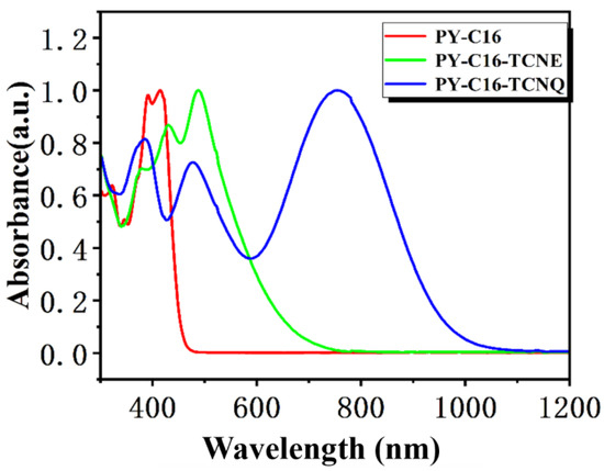 Figure 2 shows the UV-vis absorption spectra of pyrene derivatives (PY-C16) and their click reaction products (PY-C16-TCNE, PY-C16-TCNQ) in dichloromethane solution. It can be clearly seen that the maximum absorption peak of PY-C16 is around 400 nm, which is related to the π-π* transition absorption of the pyrene conjugated group of the molecule [40]. Compared with PY-C16 before the click reaction, the maximum absorption peaks of PY-C16-TCNE and PY-C16-TCNQ after the click reaction were red-shifted to around 500 nm and 780 nm, respectively. The red-shift of the absorption peak is mainly due to the strong electron withdrawing group (cyano group) in the click reagent. The introduction of the cyano group in the click reagents (TCNE and TCNQ) will reduce the density of the π electron cloud in the molecule, and the molecular π-π* transition energy will decrease. In addition, the same comparison between PY-C16-TCNE and PY-C16-TCNQ can be drawn, due to the existence of the quinoid conjugated structure in TCNQ. But because the π-conjugated structure of PY-C16-TCNQ is larger, the π-π* transition energy is thus further reduced, and the absorption peak is more red-shifted.