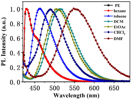 Normalized photoluminescence spectra of PY-C16 in different solvents.