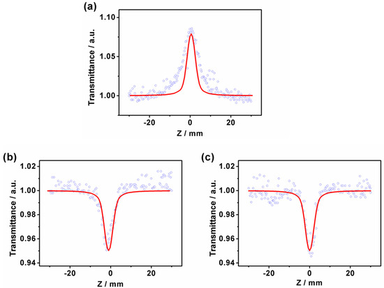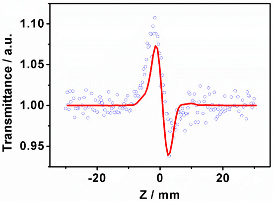 To determine the NLO properties of the above three pyrene derivatives, Z-scan measurements were performed using a nanosecond pulsed laser at 532 nm. The curves measured by the Z-scan method not only allowed the sign of the NLO coefficient of the material to be determined, but also the NLO refractive index and NLO absorption coefficient of the material were able to be obtained by further calculations [44,45].