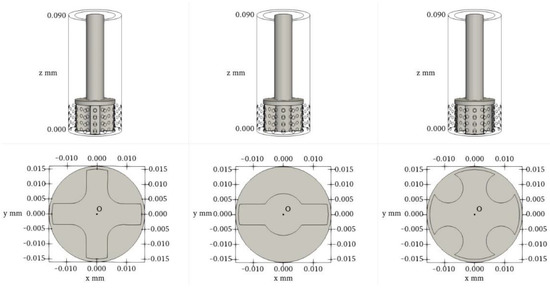 Rotor designs used in this study. The feature edges of the stator are in the top row of figures. The origin O denotes the coordinate (0, 0, 0). The bottom of the mixer is at z = 0 mm, with the z axis coincident with the axis of the rotor.