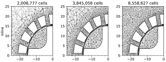 Zoom on the rotor–stator mixer meshes that were used for the grid independence analysis. The slice corresponds to z = 13 mm (confer Figure 1 for the frame of reference).