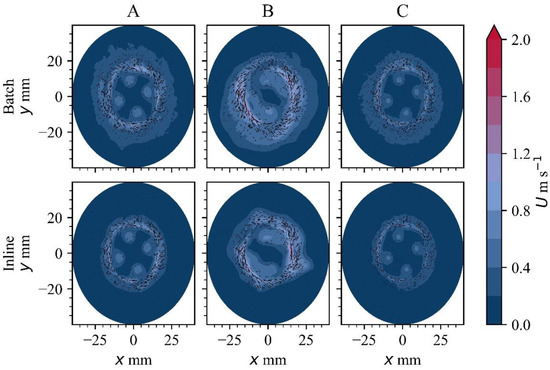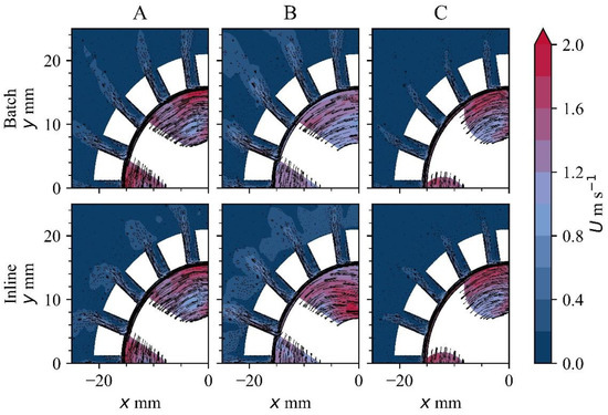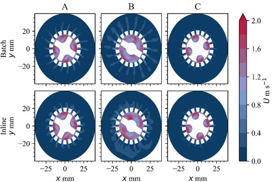 Velocity contours along the plane cutting through the third row of holes in the mixer, corresponding to z = 13 mm (confer Figure 1 for the frame of reference) for a rotor speed of 1000 RPM predicted using the k-ω SST turbulence model. The top row of contours corresponds to batch mode and the bottom row to continuous mode. The rotor moves anticlockwise.