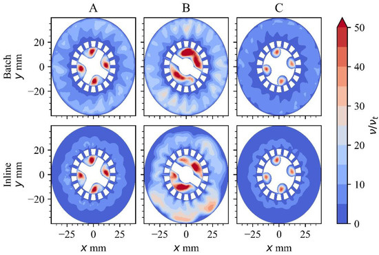 Figure 6 shows the corresponding kinetic turbulent viscosity ratio for each case. This ratio was obtained by dividing the kinetic turbulent viscosity field by the laminar viscosity of the fluid and shows where distributive mixing is expected to occur. Two main observations arise from these contours: (a) As in the previous mixer design study [25], the overall mixing effect is not severely degraded by operating the mixer in inline mode as the turbulent viscosity values between both operating modes are comparable; this shows that a continuous melt treatment of slow-moving melt is possible, and the melt conditioning technology can readily be transferred to launders or conduits of melt following the tundish. (b) The effect of the rotor choice is more consequential on the mixing performance that any degradation that would arise by switching melt conditioning from a batch treatment mode to a continuous treatment mode.