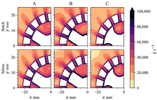 The predicted power number for each rotor design is shown in Table 5. Rotor B, having the largest power draw (the working fluid, mixer diameter, and rotor speed being the same in all cases) to shear the melt is less effective; i.e., it will require more power to provide the same disintegration rate (shown in Figure 7) as the other designs. As noted in the volume flow rate section, the power draw of each rotor is not severely affected by switching between batch and inline modes, with only a slightly significant increase when switching to inline treatment.