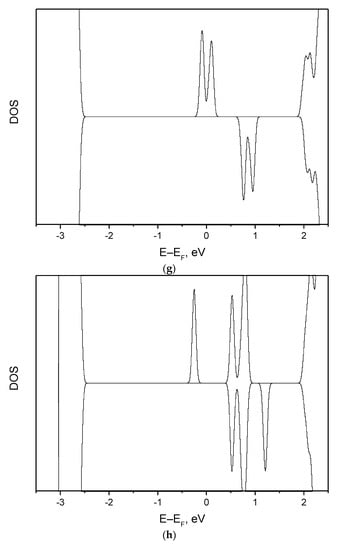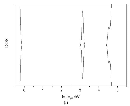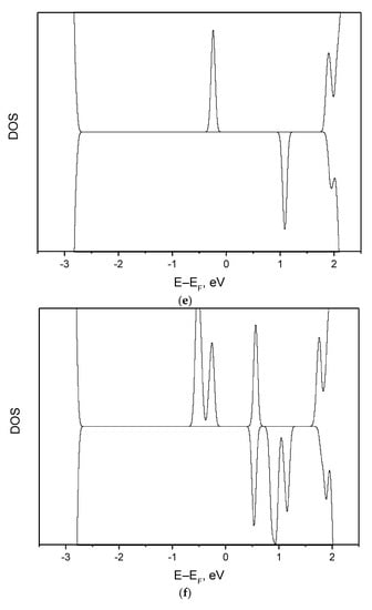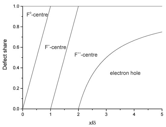 The density of states analysis has confirmed that in a general case (Figure 3b–d,f–h) there is a superposition of two types of noninteracting defects, as described in Table 4 and shown in Figure 1. Note that in a combination of two defects (Figure 3b–d,f–h) the size of the defect peaks is proportional to the share of the corresponding defect (Table 4). In special cases (x/δ = 0, 1, 2) we can assume the presence of just one particular type of defects (F0-, F+- or F++-centre) with one Figure 3a,i or two peaks Figure 3e. The positions of these three peaks relative to CBM remain practically the same for all combinations of defects.
