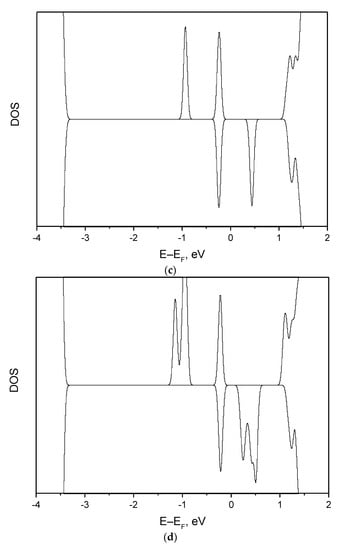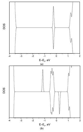 The electronic properties analysis revealed that calculated band gap of 4.4 eV in comparison to the experimental values of 5.8 eV [] is underestimated. This underestimate, however, does not affect the main conclusions. The Hubbard correction of U-J = 4 eV, expanding the gap by 0.2 eV, was discarded. Oxygen vacancies create distinct defect levels ~ at 0.8, 1.5 and 2.3 eV below the Conduction Band Minimum CBM (Figure 3). A similar peak in DOS was reported by Vlasov et al. in [] for x/δ = 0 and 2. Our considerations suggest that in both cases there is a single defect level in the band gap, ca. 1.5eV below the CBM. The position of the defect levels in that study [], however, is much closer to the valence band ~0.5eV, which can be attributed to the computational method applied.
