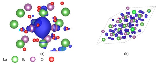 For computational modelling of oxygen vacancy in lanthanum scandate we deployed the computer code VASP 6.1.2 The primary calculation details and the core potential details are given in Table 1 and Table 2, respectively. The ideal structure of undoped LaScO3 was completely optimized (Table 3, Table A1, Figure A1). For Sr-doped material and vacancy calculations, the lattice constants were kept fixed. Experimental measurements [] suggest that lattice constants for doped material (x ≤ 0.09) are only 0.02 Å larger, which is negligible for oxygen vacancy calculations. Although the electronic structure of the ideal compound suggests diamagnetic state, particularly for defect calculations spin-polarization was enabled.