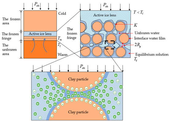 For the one-dimensional freezing system, the soil skeleton is compressed in the process of ice segregation. When the pressure inside the pore reaches the local maximum at the pore diameter, the unfrozen water film on the clay surface is no longer thinned with the occurrence of freezing, and the slow flow velocity can be regarded as a quasi-steady state [10]. In order to meet the further occurrence of freezing, the thermal molecular force between the ice–soil interface pushes the clay particles to the warmer end to provide space for further growth of ice crystals [25]; at this time, tiny cracks are formed between adjacent clay particles [26]. When the curvature of the ice crystal is K > 2/Rp, the ice crystal can further grow to the crack, forming a new ice lens [27]. It was therefore concluded that the separation pressure, Ph, between adjacent clay particles during freezing was closely related to the critical pore throat’s radius, Rp, and ultimately affects the formation of new ice lenses. Therefore, when considering the surface electrical properties of clay particles, the separation pressure between frozen clay particles can be equivalent to the ice pressure that can resist the interaction of surface forces and external loads.