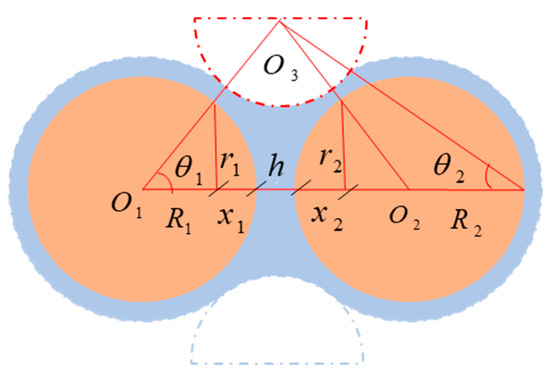 The geometric relationship of clay particles with a distance of is shown in Figure 2, where R1 and R2 represent the radius of adjacent clay particles, respectively. The hypothesis is R1 = R2 = Rh, where R is the radius of a uniform spherical clay particle. Using the Pythagorean theorem, the geometric relationship between adjacent clay particles can be expressed as follows:
