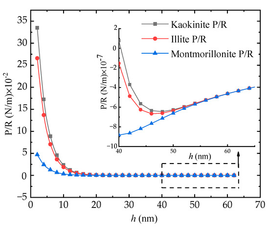 Figure 5 shows that the different mineral types of clay vary with the distance between particles when the freezing temperature is −0.68 °C. When the particle spacing is equal to 2 nm, the separation pressures between kaolinite, illite and montmorillonite are 0.335R, 0.266R and 0.047R, respectively; When the particle spacing is equal to 4 nm, the separation pressures between kaolinite, illite and montmorillonite are 0.173R, 0.137R and 0.024R, respectively; and when the particle spacing is equal to 6 nm, the separation pressures between kaolinite, illite and montmorillonite are 0.089R, 0.071R and 0.013R, respectively. Therefore, the separation pressure of the three mineral components increases with the increase of the particle spacing. However, when the particle spacing is constant, the separation pressure of kaolinite and illite is not different; instead, it is about one order of magnitude lower than that of montmorillonite. This is mainly due to the different charge densities on the surface of the minerals. From Equation (22), it can be seen that the influence of the surface force on the separation pressure between particles is proportional to the charge density on the surface of the minerals. This conclusion is confirmed by the existing literature [48].