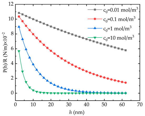 It can be seen from Table 2 that, although the surface potential of kaolinite is about three times that of montmorillonite, it has no effect on the Debye length k−1. Therefore, it can be considered that the influence of solution concentration on the separation pressure between particles is mainly realized by affecting the Debye constant. Taking the NaCl solution as an example, by substituting the relevant parameters in Table 2 into Equation (22), the effect of different solute concentrations (0.01 mol·m−3, 0.1 mol·m−3, 1 mol·m−3 and 10 mol·m−3) on the separation pressure between adjacent clay particles is calculated, the results are shown in Figure 6.