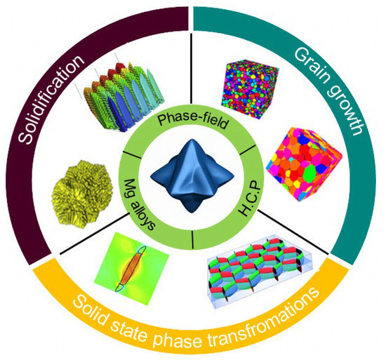 Microstructure is one of the vital factors that determine the mechanical properties of magnesium (Mg) alloys. However, traditional microstructure characterization methods hardly satisfy the needs of tracking the morphological evolution of Mg alloys. With the rapid development of computer simulation, using the phase-field method to simulate the evolution of microstructures in Mg alloys has become the new norm. This article provides a review of the applications of the phase-field method in Mg alloys. First, classic phase-field models and the derived multi-phase and polycrystalline phase-field models are reviewed, then a review of the twin and solid-state phase transition phase-field models was undertaken, and the research progress of phase-field simulation in the solidification, recrystallization, and solid-state phase transformation of Mg alloys, were gradually introduced. In addition, unresolved problems of phase-field simulation were summarized, and the possible direction of future studies on phase-field simulation in Mg alloys field were discussed.