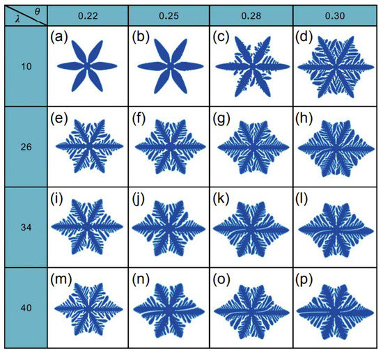 Effect of undercooling () and coupling constant () on dendrite morphology of magnesium alloy. (a–p): dendrite morphology under different undercooling () and coupling constant () combinations [74].