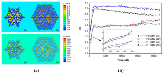 In addition to the temperature field parameters, the concentration also affects the dendrite morphology. For this purpose, based on the KKS model, Yao et al. [75] performed a more quantitative investigation about the effects of solute diffusion on the dendrite growth in AZ91D alloys. The simulation results found that the larger the undercooling is, the higher the concentration in front of the dendrite tip and the axis center of dendrite arm is, the smaller the boundary thickness of concentration in front of the dendrite tip is and the severer the micro segregation is. Other factors may also influence the dendrite shape. According to Duan et al. [76] simulation results, with the increase of the interfacial energy anisotropy, the instability of the primary dendrite arm increases, which leads to the growth of many side branches, the growth rate of the dendrite tip increases, and the tip radius decreases, which is consistent with the microscopic solvable theory. Meanwhile, Duan et al. [76] also revealed the effects of different supersaturation on the morphology of dendrites. It is found that as the supersaturation increases, the dendrite changes from snowflake-like to circle-like morphologies. The applied pressure is also associated with the morphology of the dendrites. To study the effect of pressure on the dendritic growth during solidification of Mg alloys, Shang et al. [77] developed a phase-field model coupled with thermodynamic calculation. The results showed that the pressure could not only refine the grain, improve the growth rate of dendrite, and make the secondary dendrite arm more developed, but also affect the micro segregation of solute, as shown in Figure 3. For instance, the effects of pressure on the segregation of Al and Sn are totally different in a ternary Mg-Al-Sn alloy. With the increase of pressure, the micro segregation of Al increases significantly, while that of Sn remains almost unchanged.