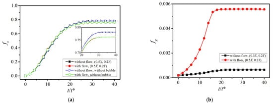 Phase fractions versus time under the two configurations corresponding to Figure 5: (a) solid fraction versus time, and (b) gas fraction versus time. Where , is the time step [82].