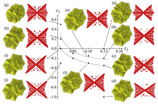 In the formula, is relaxation time. The above formula can be applied to 2D phase-field model, but it is useless for 3D simulation. For three-dimensional anisotropy functions, Bottger and Eiken et al. [43,63,64] did a lot of work, a general form of the anisotropy function with equal strength of anisotropy in the basal and in normal direction is presented [43]: