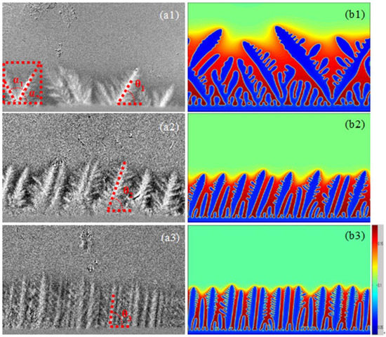 In the process of directional solidification, original angle of dendritic growth is an important issue. By coupling synchrotron X-ray characterization technology and phase-field method, Wang et al. [92] studied the effect of low cooling rate on the directional solidification of Mg-Gd alloys under a fixed temperature gradient. When the cooling rate is low at R = 0.033 K/s, as shown in Figure 9a1, the growth direction of dendrites prefers the crystal direction <110>, the angle between primary dendrites is , and . Due to the competition between the crystal anisotropy and thermal gradient, as the cooling rate increases, the thermal release becomes increasingly dominant, and the original angle of dendritic growth gradually rotates from (the preferred crystal direction) to (close to the temperature gradient direction), as shown in Figure 9a2,a3. This indicates that the selection of original angle of the dendrites is related to the cooling rate and temperature gradient. Subsequent the phase-field simulations shows that the lower cooling rates lead to the large misorientation angle of dendrite morphology, which represents the stronger competitions among dendrites, will finally decrease the amount of dendrites per unit area and increase the primary dendrite arm spacing. Meanwhile, the interface tips have high tendency to collide with each other under the lower cooling rate, which could block the interface movement.