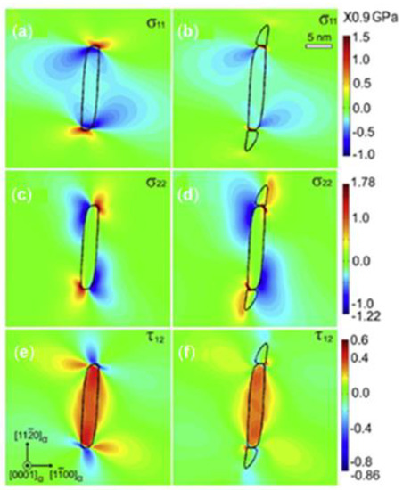 In solid-state phase transformation, the mismatch between the atoms on the interface between the variant and the matrix is inevitable. These lattice mismatches will produce elastic strain energy , which is one of the main driving forces to control the morphology of secondary phase particles. The elastic strain energy term is usually described according to Khachaturyan’s microelasticity theory [55], and the stress distribution around the precipitates can be reflected by the stress field . The system of the total free energy form [55], is as follows: