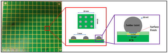 The test vehicle is a coupon of PCB made of FR-4 glass epoxy with 10 mm × 10 mm × 1 mm dimensions, as shown in Figure 1. Each testing coupon consists of a full array of nine SAC305 solder joints. Each 30 mil-diameter joint is reflowed after being attached to a 22 mil SMD Cu pad. The pitch between joints is 3 mm to assure enough space among joints during testing. OSP is the only surface finish utilized in this work.