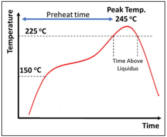Typical SAC305 solder paste reflow profile is utilized for reflowing the solder joints. The profile starts with a preheating phase to 150–225 °C/200 s, followed by an increase to a peak temperature of 245 °C with less above liquid period than typical SAC305 paste. This is due to the direct exposure of joints to convection heat, unlike assemblies with components. Finally, the temperature is cooled down with a 4 °C/s rate. The whole reflow process is performed within a nitrogen environment. A detailed reflow profile is shown in Figure 2.