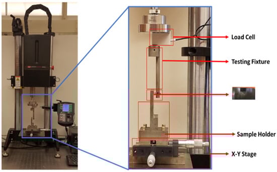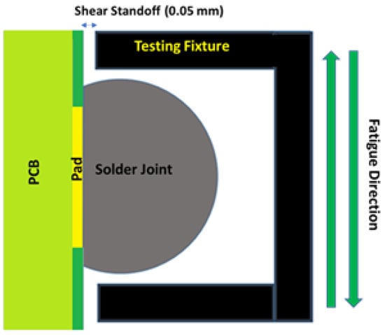 Instron 5948 micromechanical tester engaged with a customized fixture is used to implement an accelerated shear fatigue testing on individual solder joints, as shown in Figure 3. The fixture is a circular tip 1 mm in diameter utilized to cycle the joints between stress extremes. The X–Y stage, with the help of a load cell, is used to fit the joints in the middle of the tip and assure the proper tip stand-off range according to the JEDEC standard. A schematic diagram is shown in Figure 4. The displacement and the load are measured by the machine and load cell, respectively. These measurements are recorded continuously by the data acquisition system.
