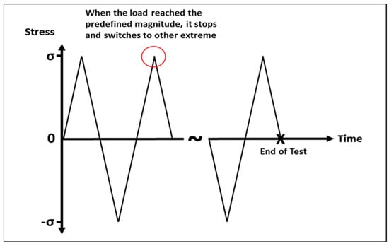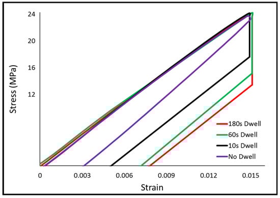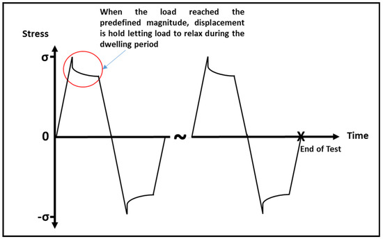 Two profiles are employed to explore the effects of creep and fatigue in addition to quantifying them. First, a stress-controlled cyclic fatigue test is implemented to examine fatigue effect only, as shown in Figure 5. Cyclic-defined stress is applied at a constant ramp rate of 0.1 mm/s on the solder joint and switched between stress extremes (positive and negative) until complete joint failure (no dwelling conditions). The second profile is of two parts: a stress-controlled followed by a strain-controlled condition, as shown in Figure 6. As soon as the predefined value of stress is reached (stress-controlled) at a positive extreme, the strain is held constant (strain-controlled) for a certain dwelling period. During this part, the material suffers from stress relaxation and/or creep; therefore, it is described as creep–relaxation. Once the dwelling is over, the joint is cycled (switched) to the negative stress extreme with the same conditions of stress and dwelling. The second test is utilized to explore the combined effects of creep and fatigue. The maximum dwelling was 180 s because negligible stress drop (damage) was observed after this duration.