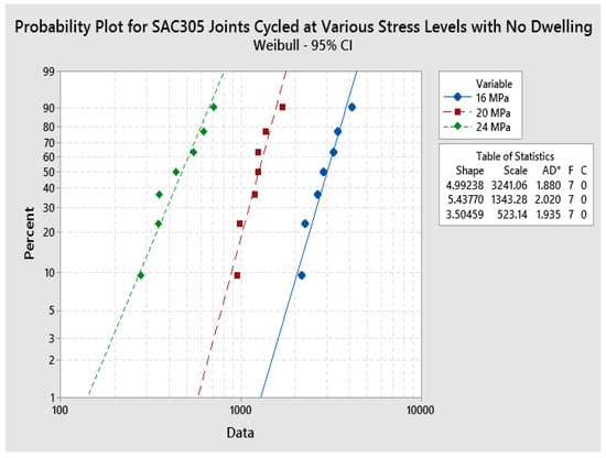 where R(t) is the reliability at time t (the probability of not fail), t is the time or number of cycles, θ is the scale parameter or characteristic life, and β is the shape parameter. Figure 7 shows the Weibull plot for joints cycled according to the mechanical fatigue profile (no dwelling) with various stress amplitudes. A significant reduction in joints reliability is observed at higher stress levels. Weibull distribution plots were constructed using Minitab Software for each stress level, considering the maximum likelihood estimation method as the parametric estimation method. The variability of data is low according to the shape (β) parameter values.