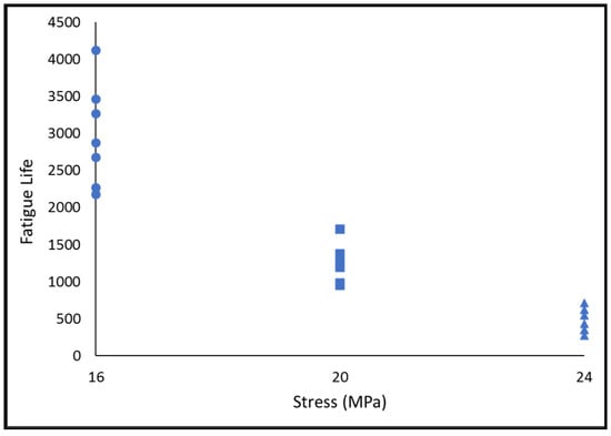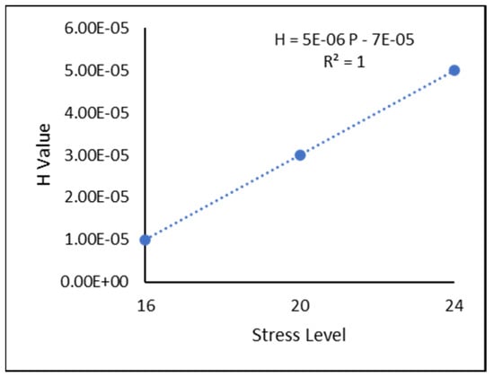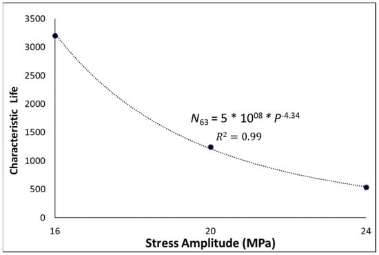 The characteristic life and stress amplitude are related according to power equation [48] shown in Equation (2).