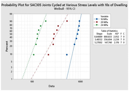 Weibull distributions for SAC305 joints cycled at different stress amplitudes at 10 s dwelling.