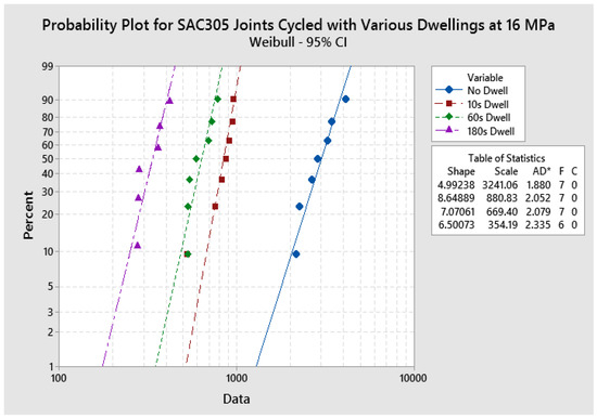 Weibull distributions for SAC305 joints cycled at different dwellings with 16 MPa stress level.