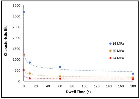 In order to examine the effects of dwelling on the fatigue life of the solder joints at different stress conditions, individual solder joints were tested at amplitudes of 16, 20, and 24 MPa with different dwell times of 0, 10, 60, and 180 s at 25 °C. The shape and scale parameters of the Weibull distribution were obtained for all combinations. In Figure 10, the Weibull plots for 10 s of dwelling level are generated. At certain dwelling times, increasing the stress amplitude leads to substantial fatigue life reduction. The same trend is found for other dwelling periods of 60 and 180 s. Moreover, at a certain stress level, the fatigue life is decreased extremely with dwellings of 10 s. Life continues to decrease with longer dwellings but in a smaller amount, as shown in Figure 11. Based on the preliminary life data analysis, only one data point was found as an outlier for the solder joints that were cycled at the 16 MPa stress level with a 180 s dwell time. This data point was eliminated from the reliability analysis. In Figure 12, characteristic life as a function of dwell time for various stress amplitudes is plotted. Creep effect (due to dwelling) was found to be substantial. There are some results for less life of lower stress and higher dwelling conditions than ones cycled with higher stress and shorter dwellings.