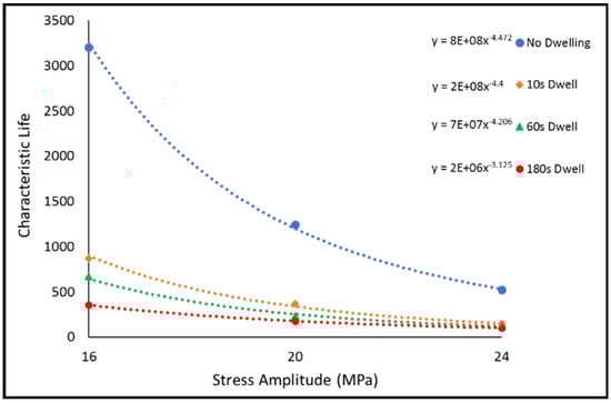 Characteristic life is a vital parameter to define reliability as a function of stress level according to Equation (1). Therefore, the characteristic life of SAC305 joints as a function of stress amplitude at the “no dwelling” condition is plotted, as shown in Figure 9. Data were fitted to a power equation which was found satisfactory to describe the characteristic life of joints as a function of stress amplitude according to Equation (2). It is concluded that the power value for the generated power equation is −4.34, which reflects the fatigue ductility exponent coefficient of the material. Moreover, increasing the stress value by a factor of 2 will lead to life reduction by a factor of 19. The ductility index (n) represents the material ductility, where the higher value of n means lower ductility. Similar results were found by others [21,66]. C constant in the stress life equation works as a scale parameter of the relationship between the fatigue life and the stress level, and n coefficient provides the shape of this relationship.