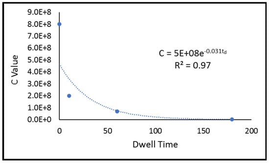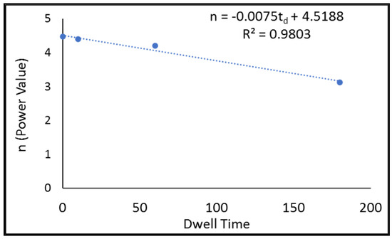 To predict the reliability as a function of dwell time and stress amplitude, the correlation between n and C values as a function of dwell time (td) must be identified. The correlations to predict the power values of n and C value as a function of dwell time are shown in Figure 14 and Figure 15. From Equation (2), the characteristic life is predicted as a function of stress amplitude and dwell time as shown in Equation (3).