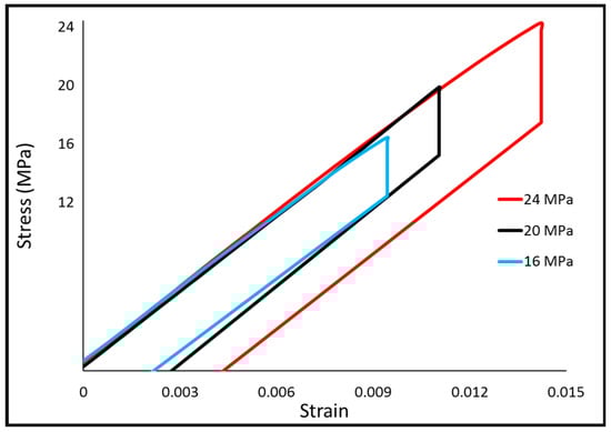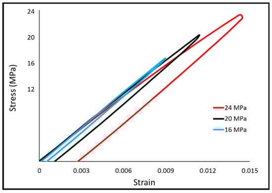 Hysteresis loops or stress–strain loops are essential to determine the damage parameters for each cycle represented by the inelastic work and plastic strain per cycle. These parameters are directly related to the accumulated damage. The loop area represents the inelastic (damage) work per cycle, where its width along the x-axis represents plastic strain. Figure 16 shows the average hysteresis loops for joints cycled with various stress levels at no dwelling. Both inelastic work (area inside the loop) and the plastic strain are obviously increased with higher stress amplitude. In Figure 17, average hysteresis loops are generated for 10 s of dwelling periods. At a specific dwelling, the same trend is observed; the hysteresis loop is enlarged drastically at higher stress levels. Moreover, more stress–relaxation is noticed with higher stress magnitudes. The enlargement of hysteresis loops is due to a massive increase in acculturated damaged work due to the creep effect in addition to fatigue damage. Consequently, evolution in hysteresis loops is generated for various dwelling times at certain stress levels of 24 MPa, as shown in Figure 18. Similar behavior is noticed for the plastic strain parameter. The higher stress or more prolonged dwelling would cause more plastic strain to be accumulated at a particular dwelling or stress levels, respectively.