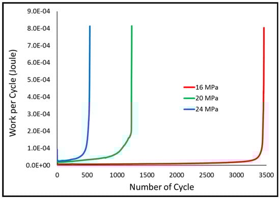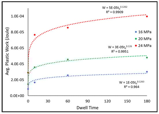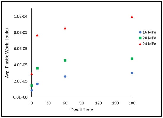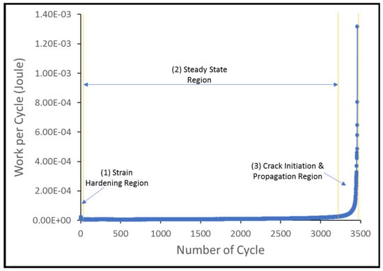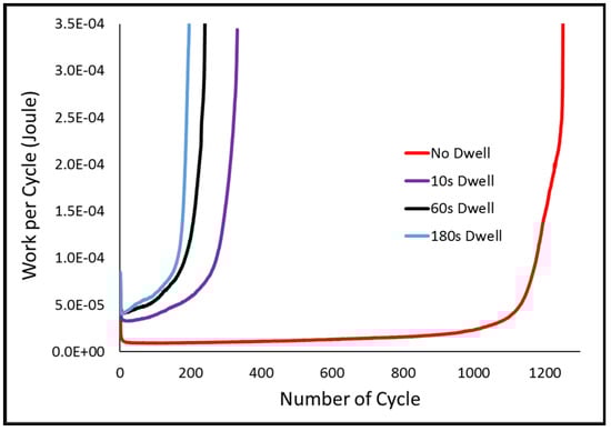 The evolution in the hysteresis loop is directly related to the damage parameters, inelastic work, and plastic strain per cycle. Therefore, it is essential to examine the progression of such parameters during the joint lifetime to explain the evolvement of stress–strain loops. Figure 19 represents the typical development of inelastic work during the joint’s life. This would provide an understanding of such behavior. The evolution is divided into three regions; the first region is the strain hardening, and it lasts for a few cycles. The second region includes the constant or steady-state region, which represents most of the joint’s life. The last phase is the crack initiation and propagation. The same behavior is noticed for all combinations of dwellings and stress levels, as shown in Figure 20 and Figure 21.